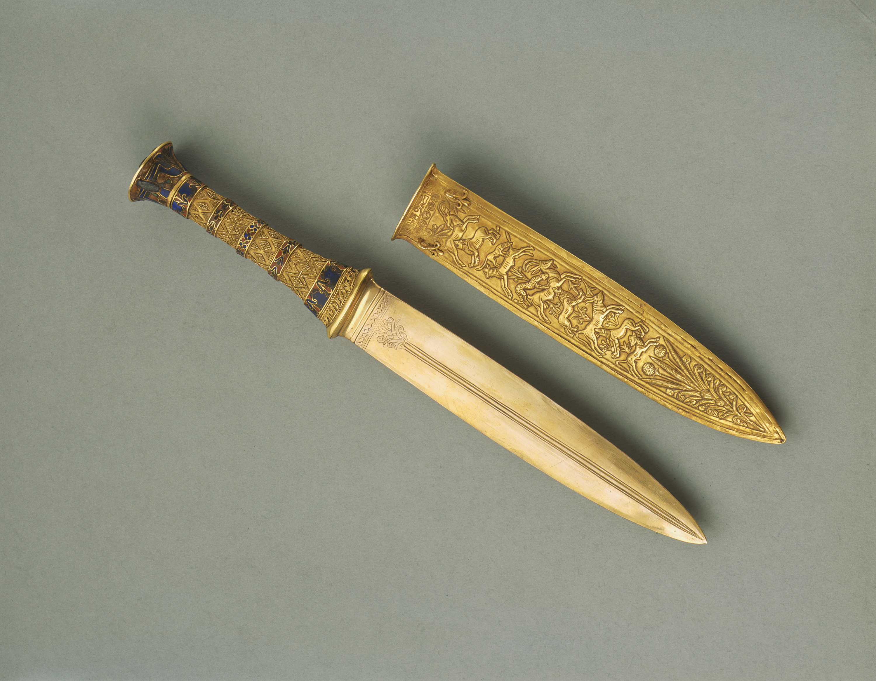 So important was this dagger to Tutankhamun that it was placed upon his mummy among the wrappings. The blade is highly polished gold with simple and elegantly engraved details. The hilt, also of gold, has alternating bands of granulated gold and cloisonn of red and blue glass. The pommel surmounting the handle has a circlet of two falcons with outstretched wings, while its top is decorated with a floral motif, in the center of which are two cartouches with the names of the king.