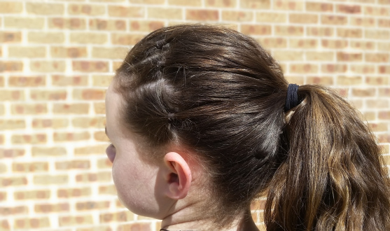1.) To start off with, do a bun in your hair, it can be any kind of bun, though I did Sophia’s knotted pigtail bun..